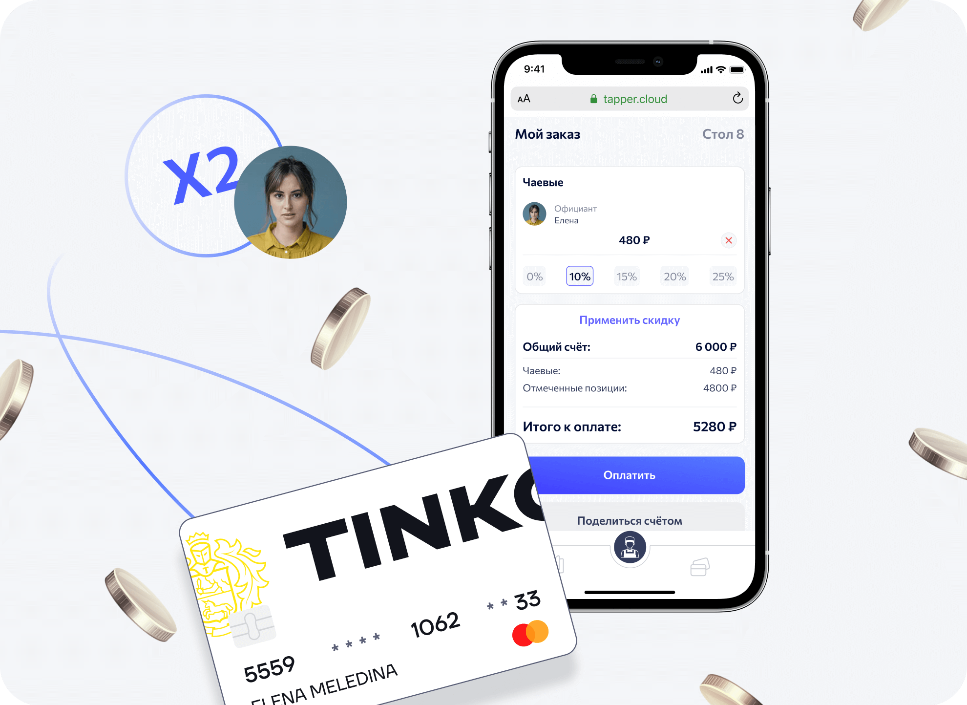 Увеличение дохода официантов в 2 раза за счёт чаевых в приложении